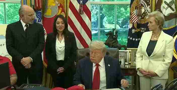 So we were having a little meeting. And at the same time, we’re signing some very important legislation, what will become legislation. And right now, it’s an executive order. And having to do mostly with education, we have our Secretary of Education, Linda McMahon, who’s been so incredible over the last few weeks. I’ve been watching her on television. I’d like to tell her she could do better, but she can’t do any better. So I want to thank you, Linda. Fantastic.